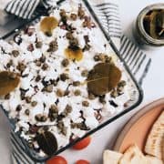Layer tomatoes on top of the eggplant, then cucumber, then olives, then feta. Add capers on top and caper leaves if using.